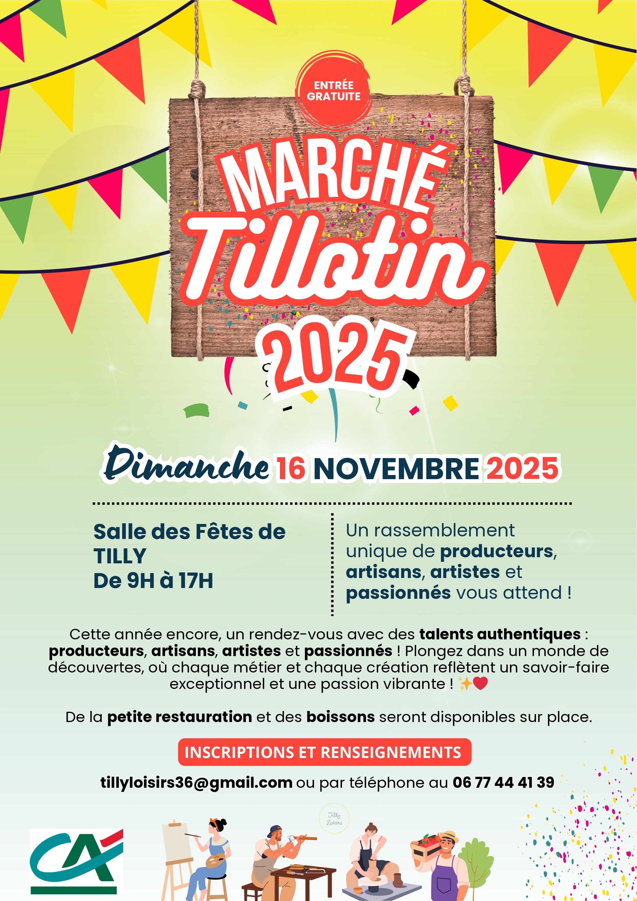 Dans le cadre des activités de la commune de Tilly, l’association Tilly Loisirs organise son Marché Tillotin le Dimanche 16 novembre à partir de 9h jusqu’à 17h à la salle des fêtes de Tilly 36310