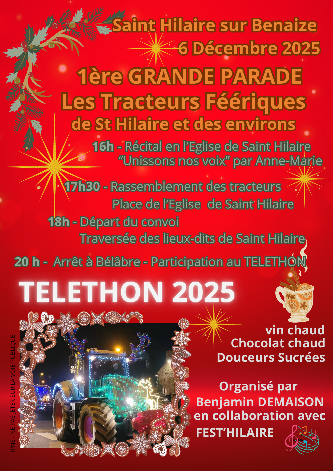 Les agriculteurs vous invitent à partager un moment convivial et magique autour d’un défilé unique ou les tracteurs, soigneusement décorés, brilleront de mille feux. Une soirée festive, dans le cadre du Téléthon, qui débutera par un récital dans l’église avant de laisser place à la magie des lumières.